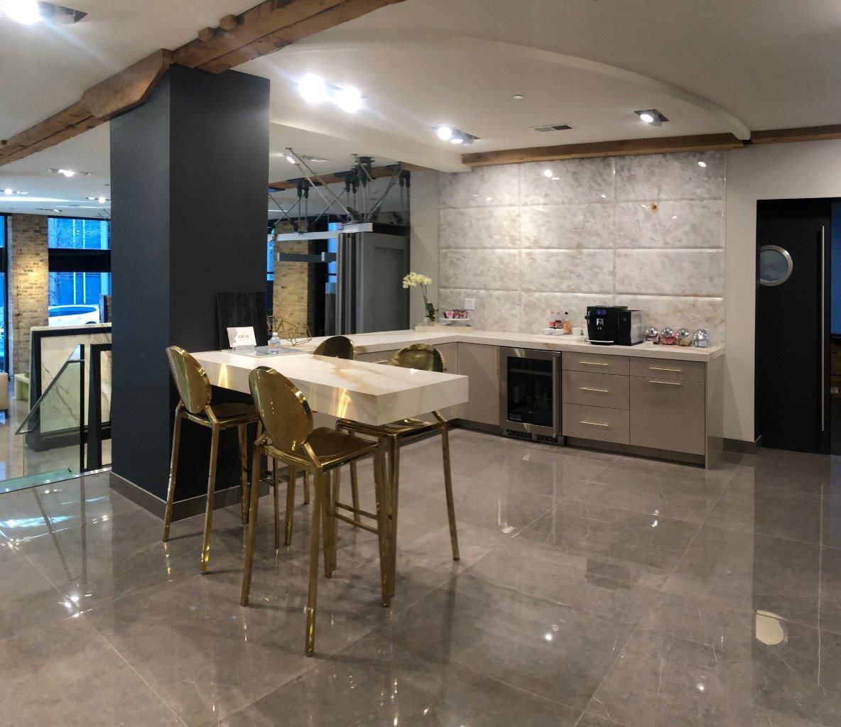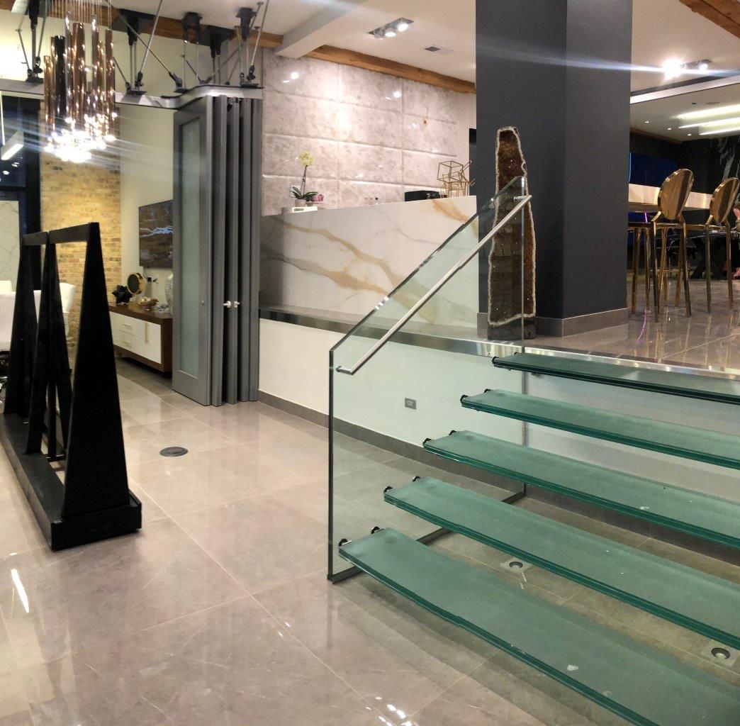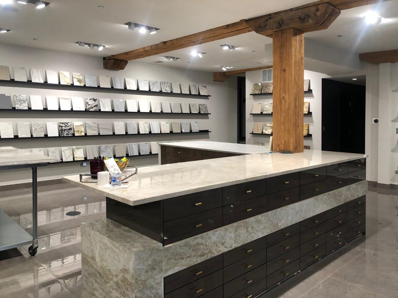 The program for the showroom included placing a large array of materials on the wall, and allow a wide display table. Exceptional examples of the quality of the work that the client can execute is visitable with the built-in desks, kitchen displays, and tables seen throughout the spaces. A glass staircase provides a dynamic material contrast to the stone displays everywhere. The large street windows provide vibrant natural light to the spaces.