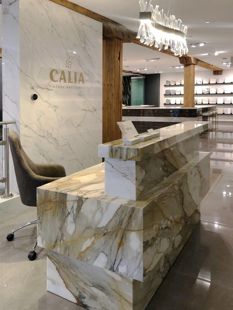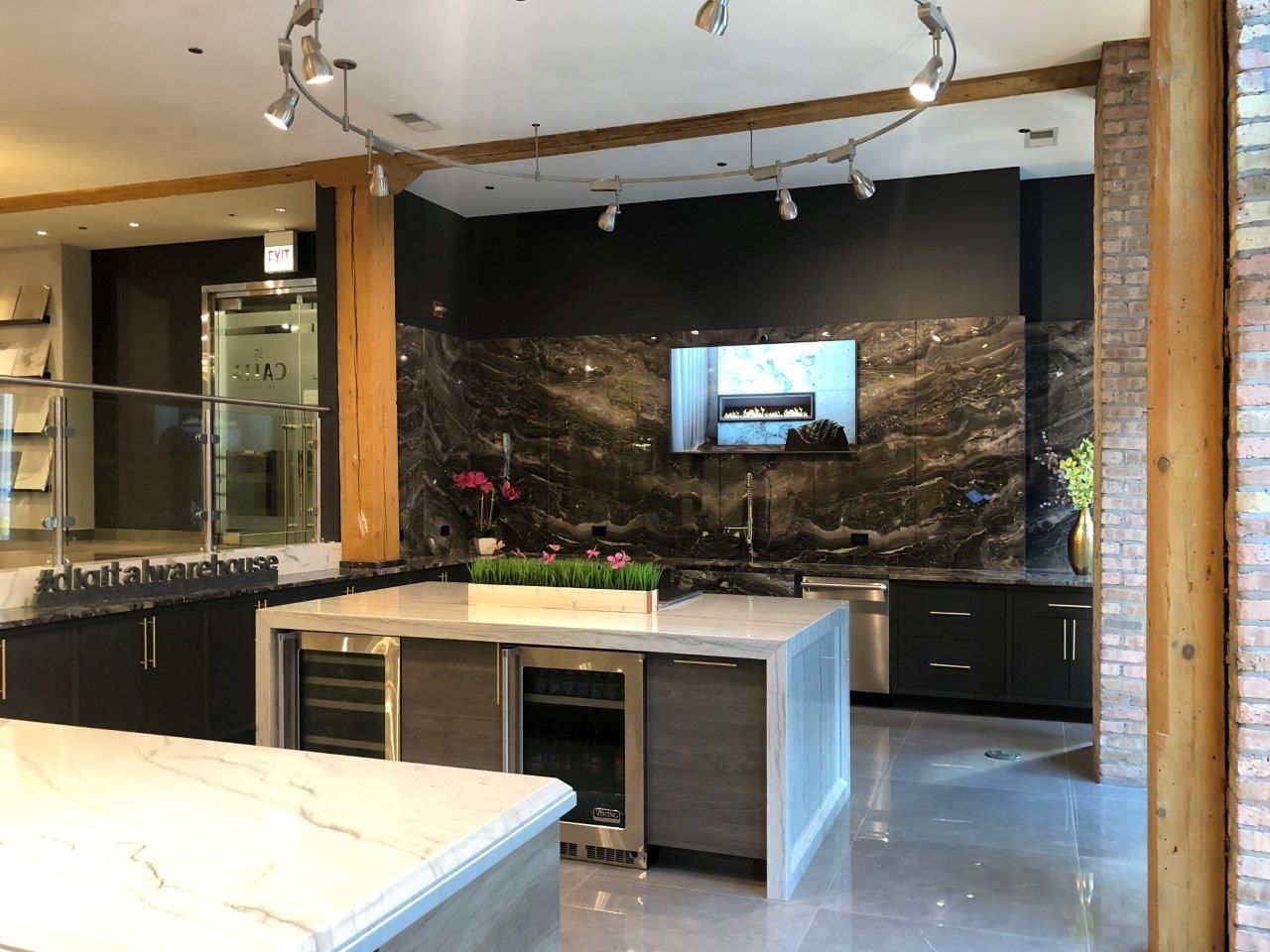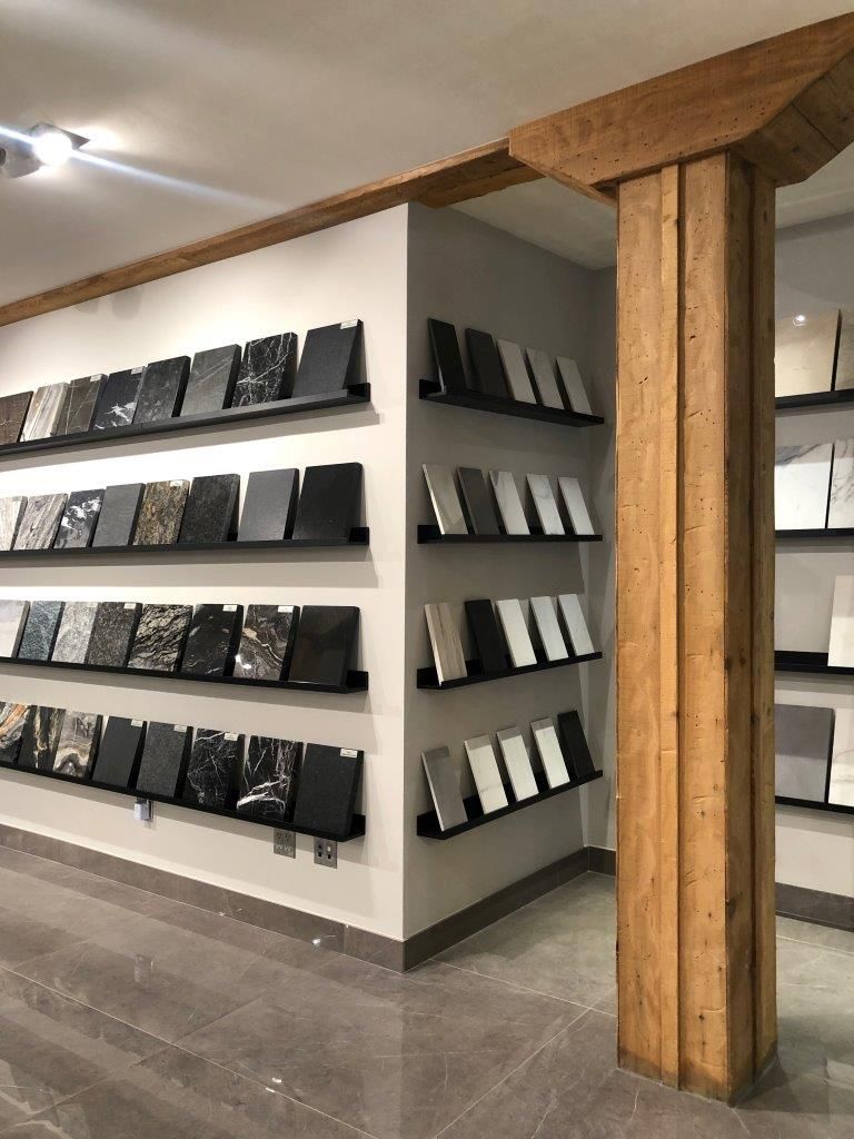 The program for the showroom included placing a large array of materials on the wall, and allow a wide display table. Exceptional examples of the quality of the work that the client can execute is visitable with the built-in desks, kitchen displays, and tables seen throughout the spaces. A glass staircase provides a dynamic material contrast to the stone displays everywhere. The large street windows provide vibrant natural light to the spaces.