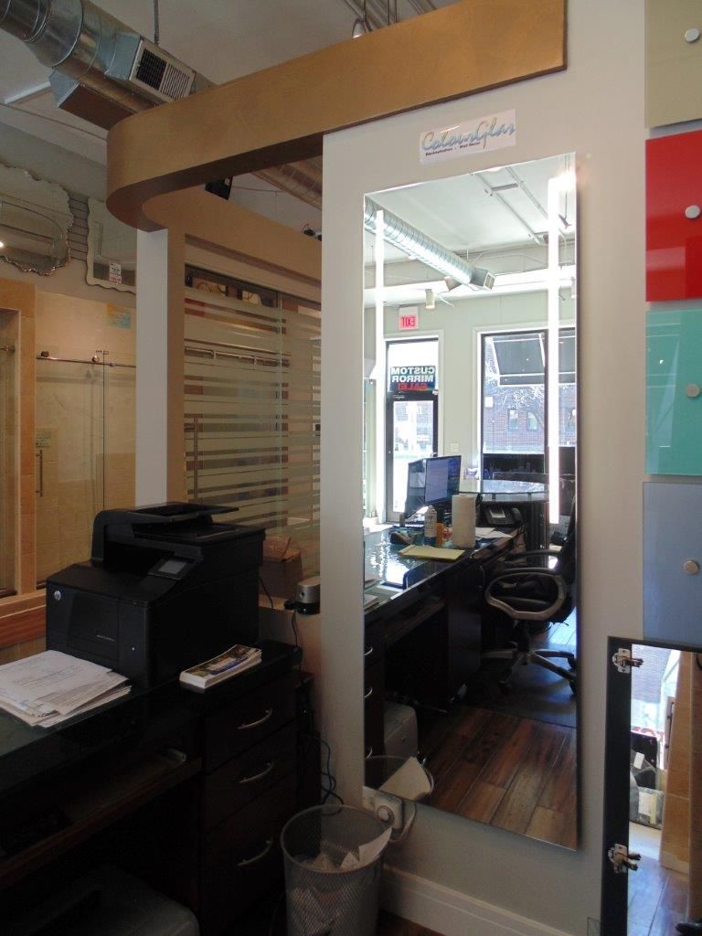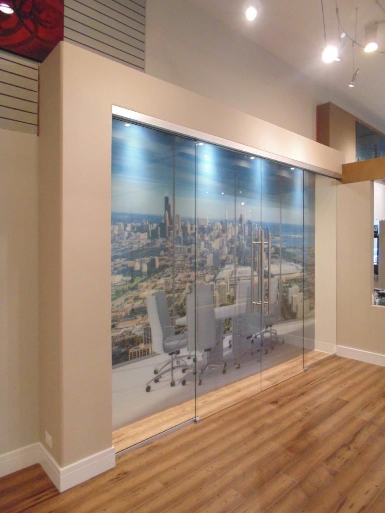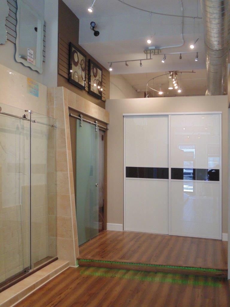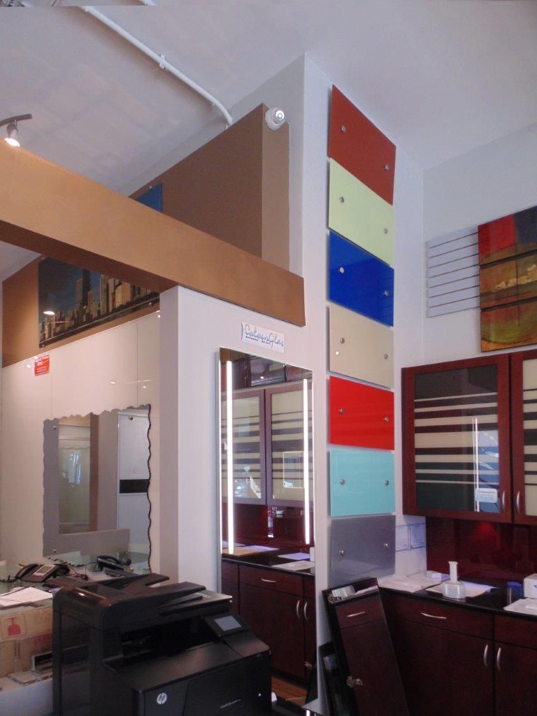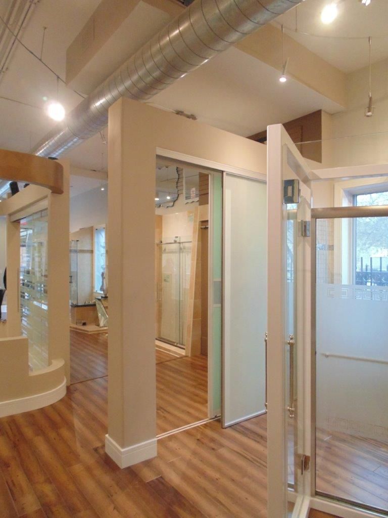And an earlier tilted existing floor was now properly leveled off so that the large-scale glass doors could easily slide. And a new panorama printed image on glass is centrally displayed to show how this product works best. Since space was limited even the reception desk cylinder anchor table serves as a hidden space for the office computers. Lighting accents the best of each exhibit.