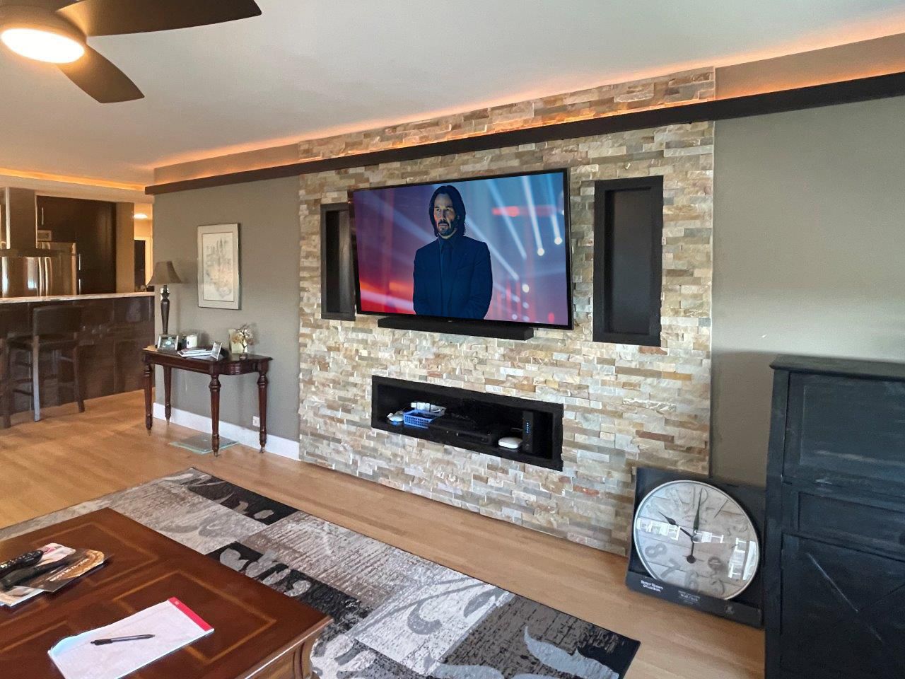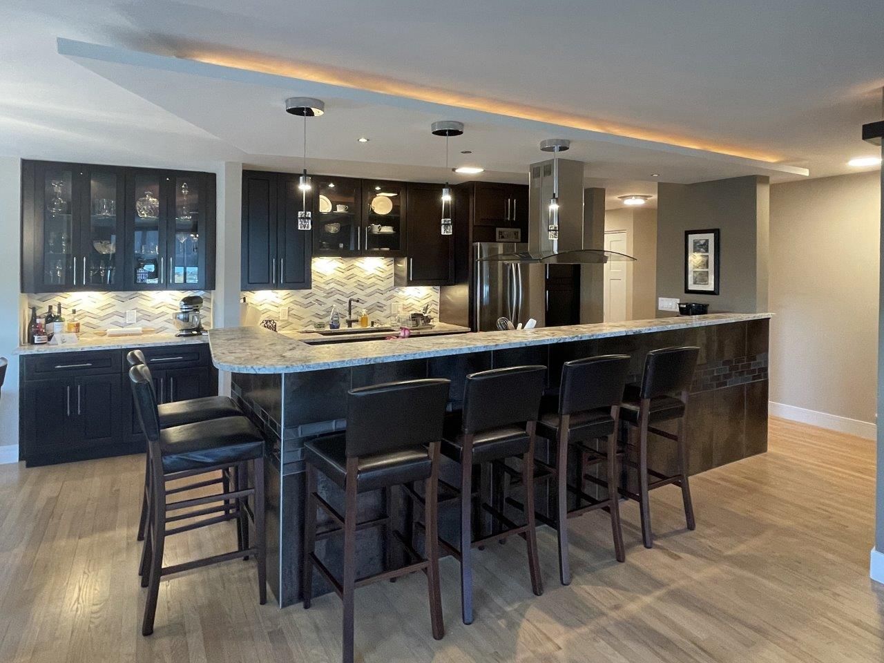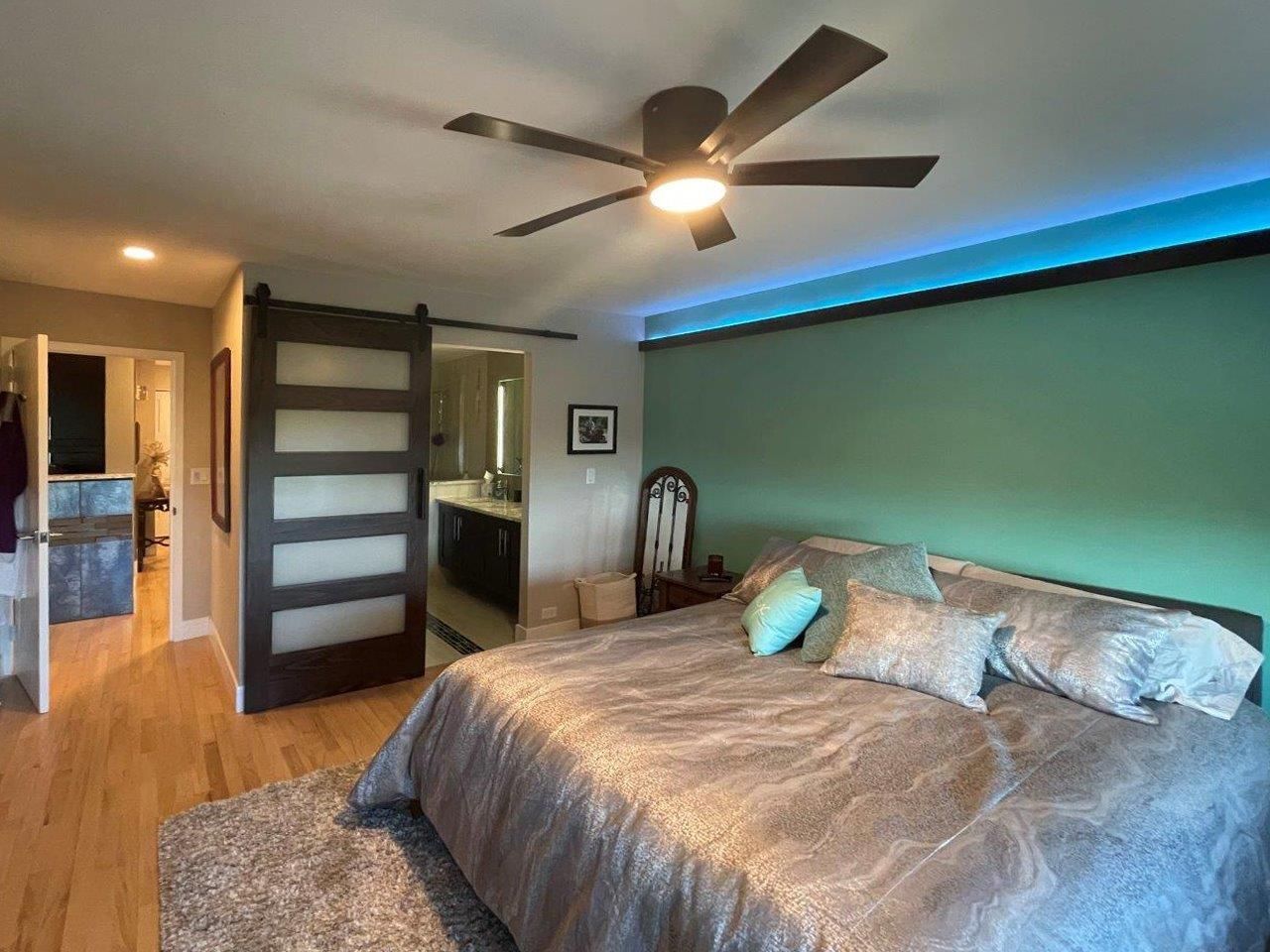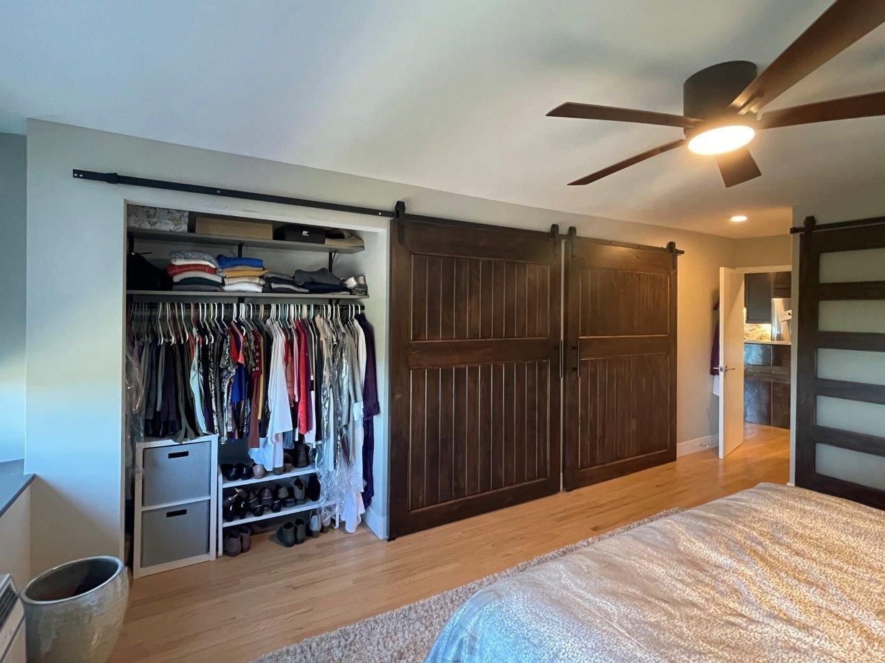 Taking advantage of the beautiful lake views, partitions walls were removed and a tremendous open Kitchen/Dining/Living area was created. The built-in media center serves as the centerpoint of the living spaces. For the Master Bedroom barn doors were incorporated into the storage spaces to maximize access and provide a built-in media center.