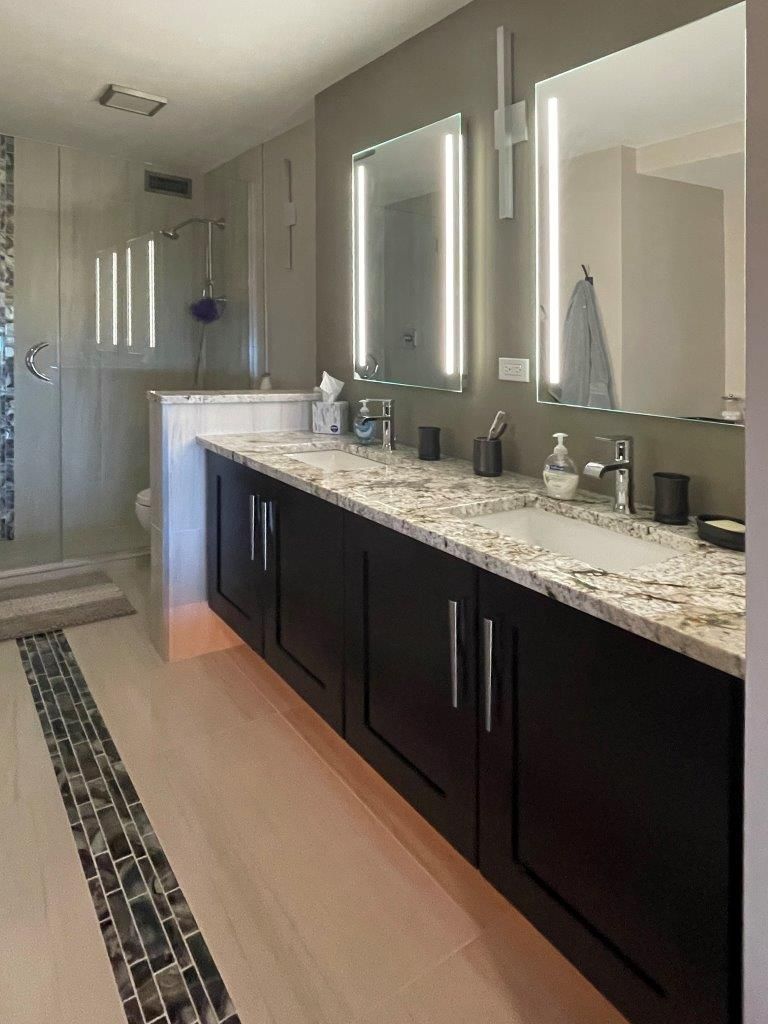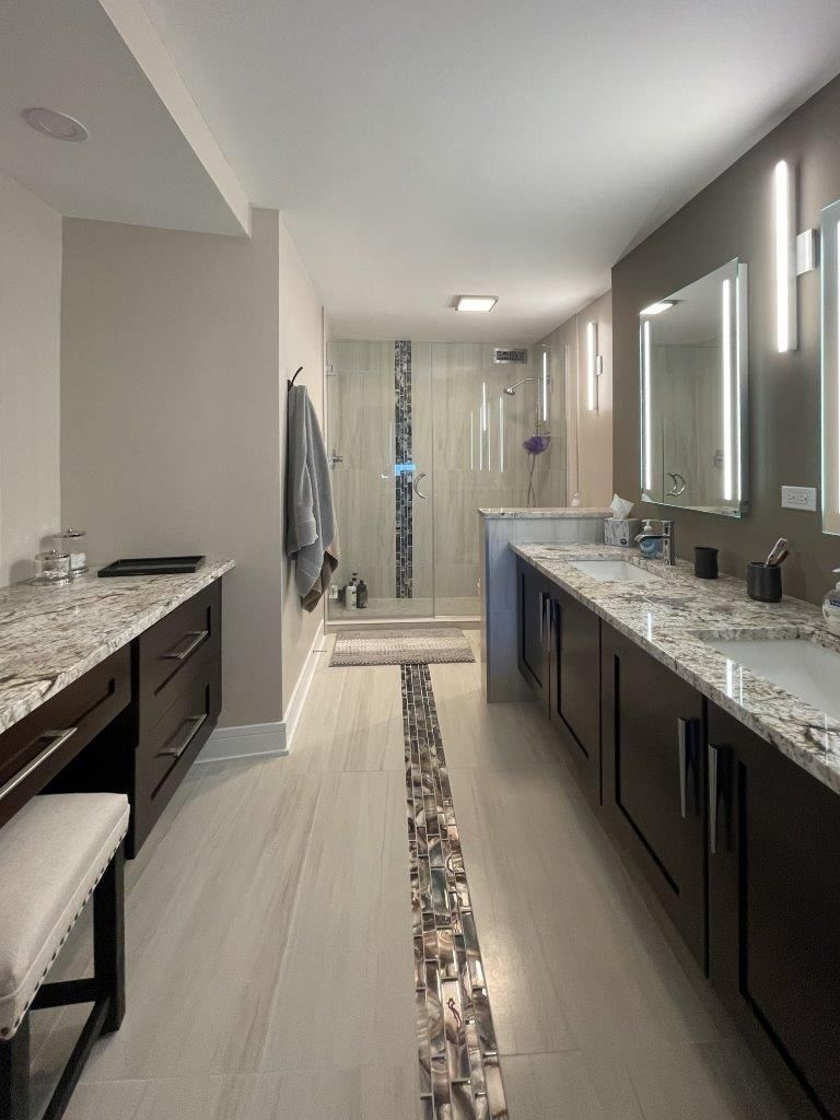 Quality material selection was key to making these spaces come to life. The existing kitchen floor was incorporated with the new flooring, and given a new color. Beautiful tile detailing in the Master Bath, along with the lighting design, bring great life to the space. Even the grill covers were custom selections to work with the fixtures of the living spaces.