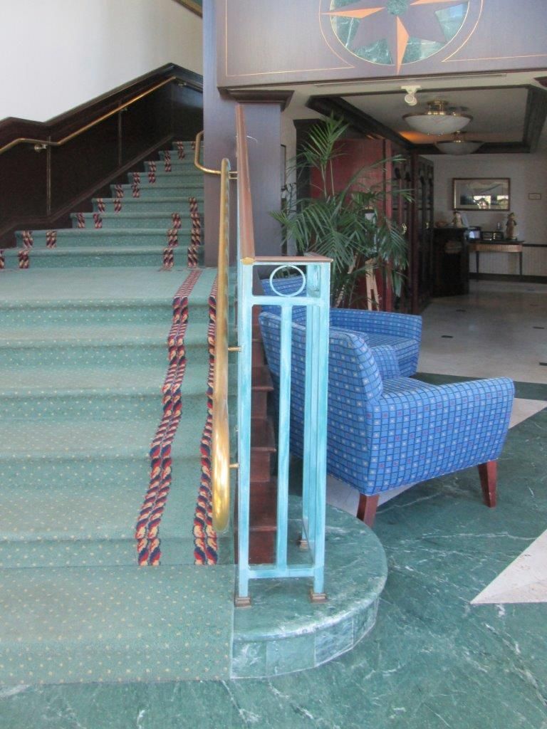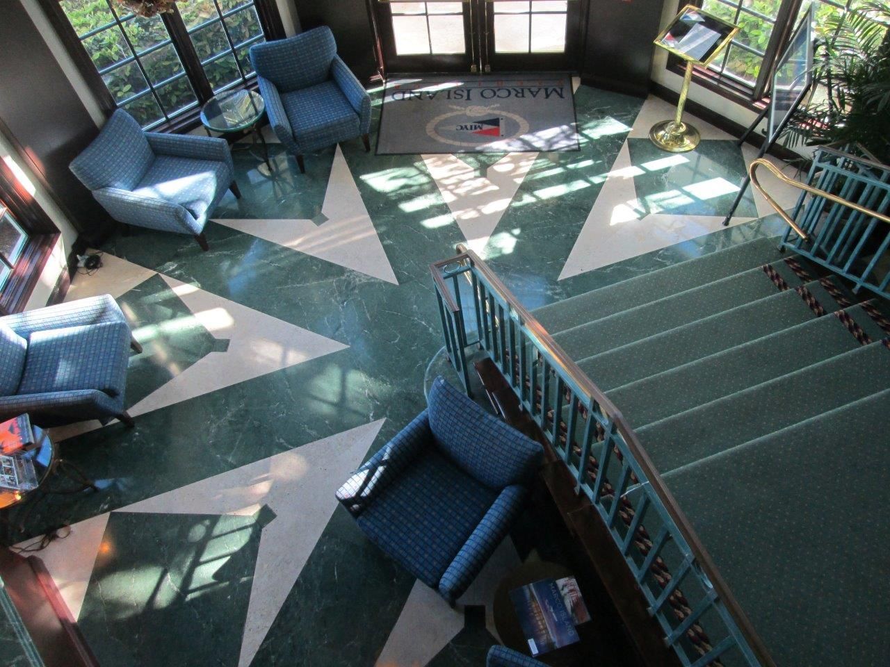 There is a detailed vocabulary at every level. The floor of the Lobby is laid out with a custom cut marble green and white marble, and this approach is repeated on the at the 2nd level terrace. A compass rose is beautifully detailed into the wood soffits. Custom handrails are depicted in a mix of metal and wood material. The high ceilings of the Dining Area allow for the natural light to enliven the room from all sides.